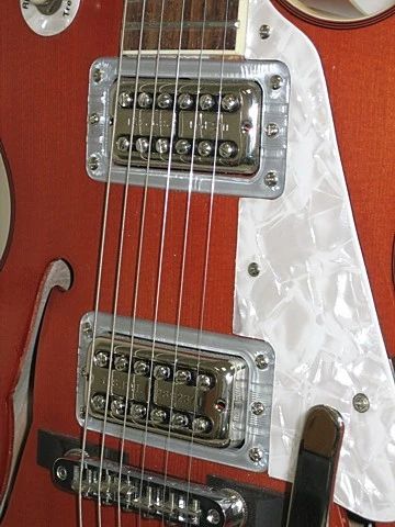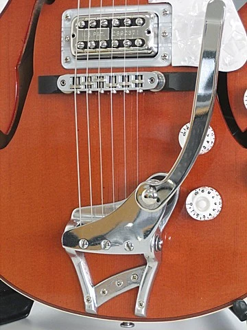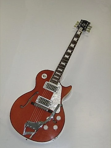 Hollow-Body Les Paul (kein Sustain-Block), eingeleimter Hals, Ebenholz Steg mit Tune-O-matik, Bone-Sattel, Bigsby-artiges Vintage Tremolo (danke nochmals W°°), Schaller-Tuner und Filtertron-Pickups. Alle Kunststoff-Parts (white-pearl) habe selbst angefertigt, ebenso den Schrifzug auf der Kopfplatte.