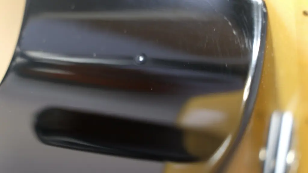 Beim Lackieren hat (vermutlich) ein Staubkorn den Weg unter den Lack gefunden, und die Halstasche rechts sieht nicht schön aus: