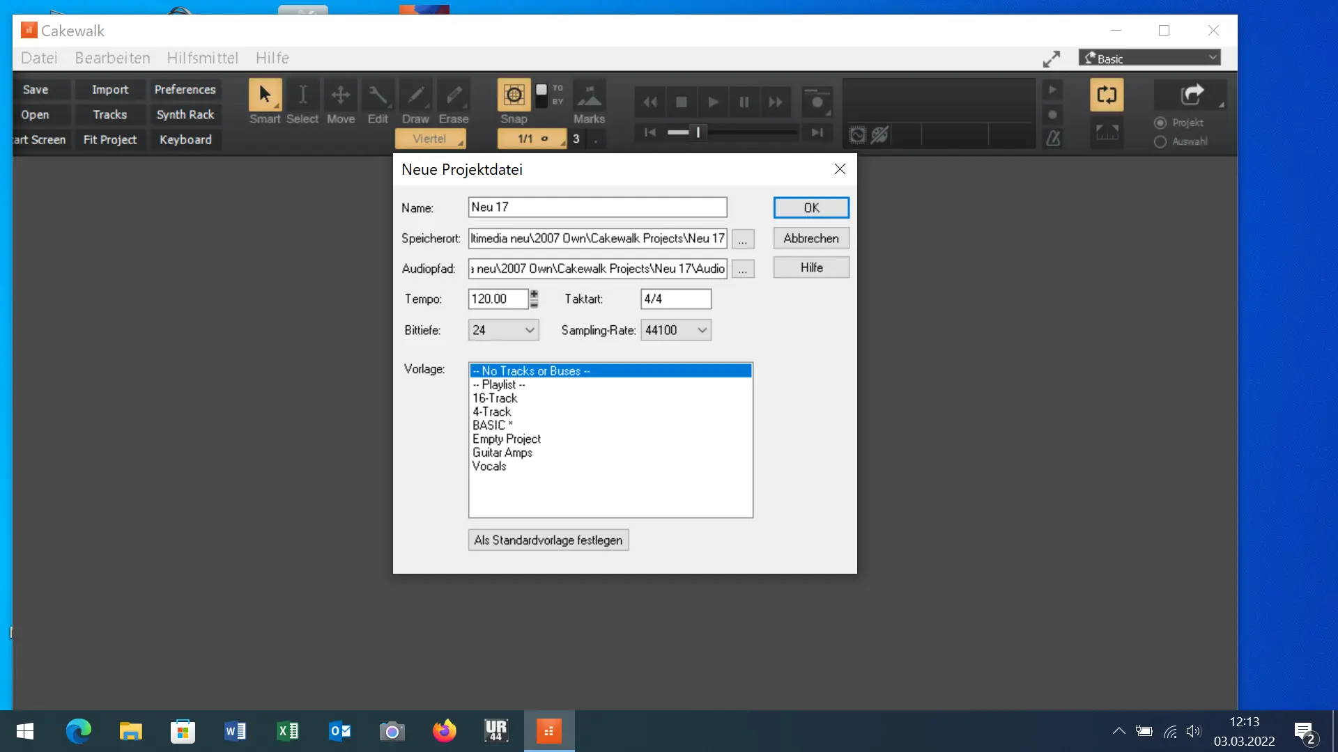 Projektnamen, Dateipfade, Bittiefe, Sample Rate, sowie Vorlage festlegen. Mit ok werden die Voreinstellungen für das neue Projekt übernommen.