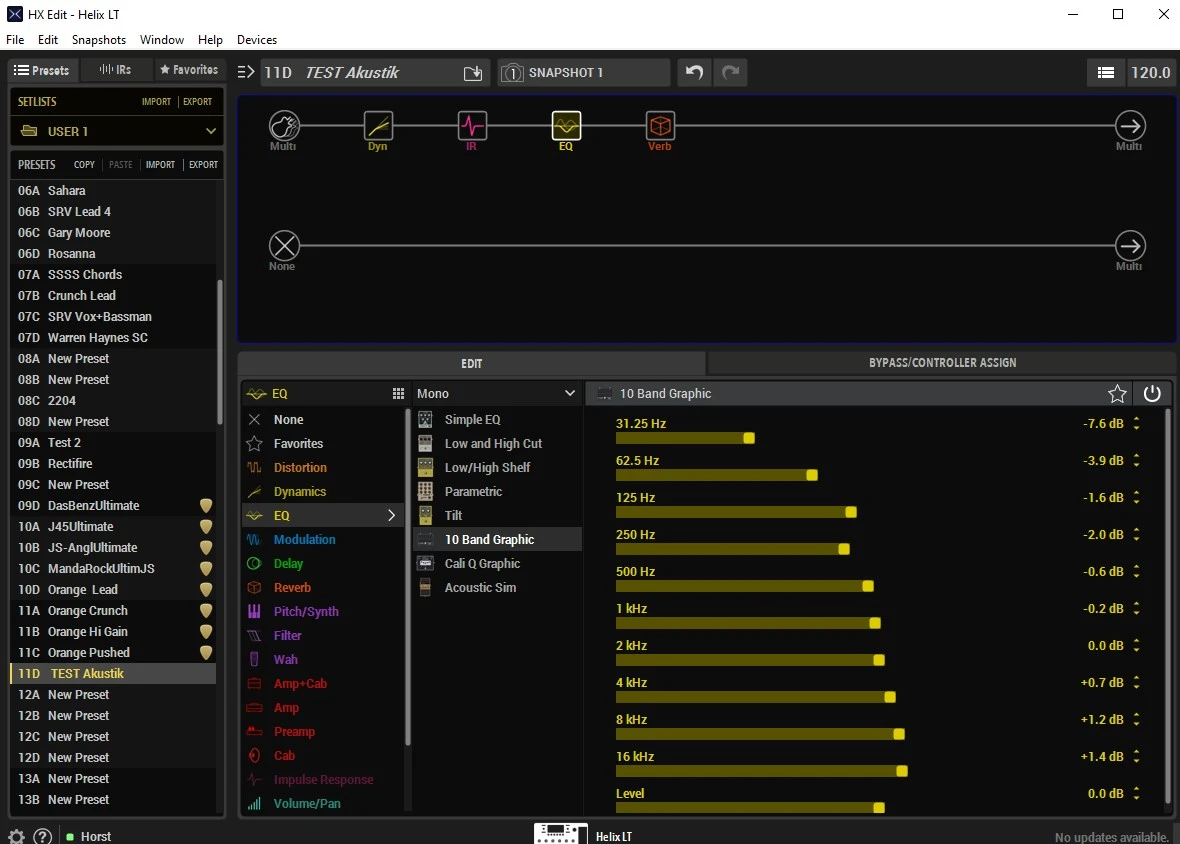 Elektrisch spiele ich das Tech21 FlyRig5 in der alten Version, ergänzt durch zwei Bodentreter und eine D.I.-Box. Das könnte ich ganz bequem durch ein FlyRig V2 ersetzen.