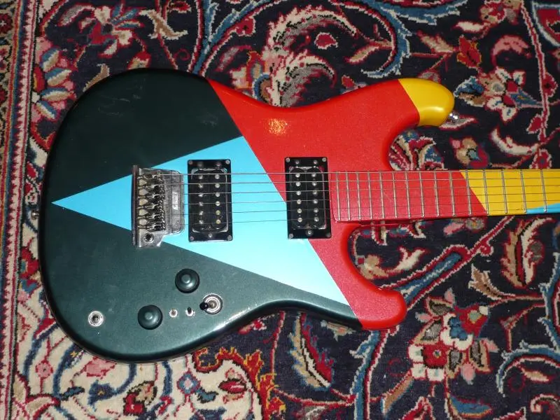 Also hab ich diese Gitarre komplett zerlegt und nach meinem (damaligen) Geschmack in der eigenen Kfz Lackiererei gestaltet. Als besonderer Gag erschien mir ein farbig lackiertes Griffbrett. Die Lackschichten sind mannigfaltig und dick und da es sich um Autolack handelt auch recht robust. Zurzeit denke ich darüber nach das ganze Trumm wieder abzubeizen aber eigentlich gehört es zu meiner Gitarrenhistorie dazu und sollte so bleiben.