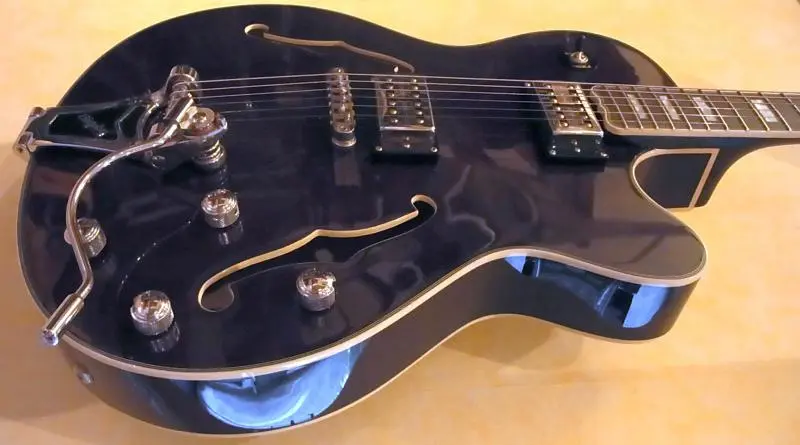 Das ist natürlich eine Axt für Rockabilly, auch Countryeskes oder Jazz, hat aber nicht den Ton einer echten Jäzzmama mit geschnitzter Decke. Dafür twängt es am angezerrten oder cleanen Ämp ganz wunderbar. Das Bigsby funktioniert ganz ok, der Winkel zum Rollensteg ist etwas flach, so daß mit dünnen Saiten die H-Saite an manchen Stellen zu schnarren beginnt. Der geschwungene Hebel liegt mir gut in der Hand.