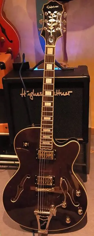 Ach ja, die Potiknöpfe hab ich vom Rockinger, die stehen ihr echt gut, wie ich finde. Die Epi-Kopfplatte ist mir zu groß und pornös, aber das ist halt so. Dafür geht sie als Vollresonanz ohne Sustainblock mit Verzerrung und geeigneter Lautstärke/Stellung zum Ämp wunderbar in Rückkopplung, was man schön kontrollieren kann (wenn man nicht in einer harten Rockkapelle spielt).